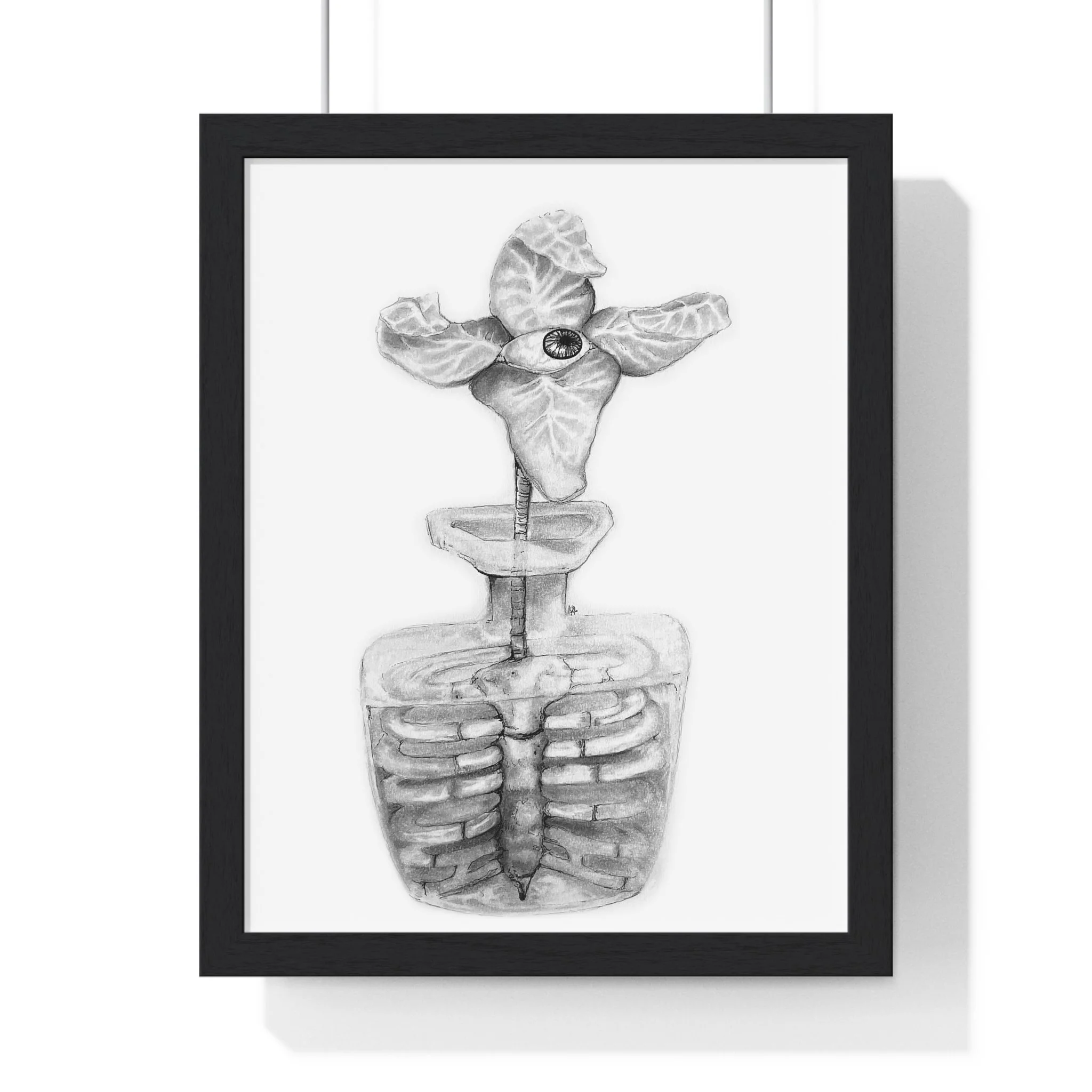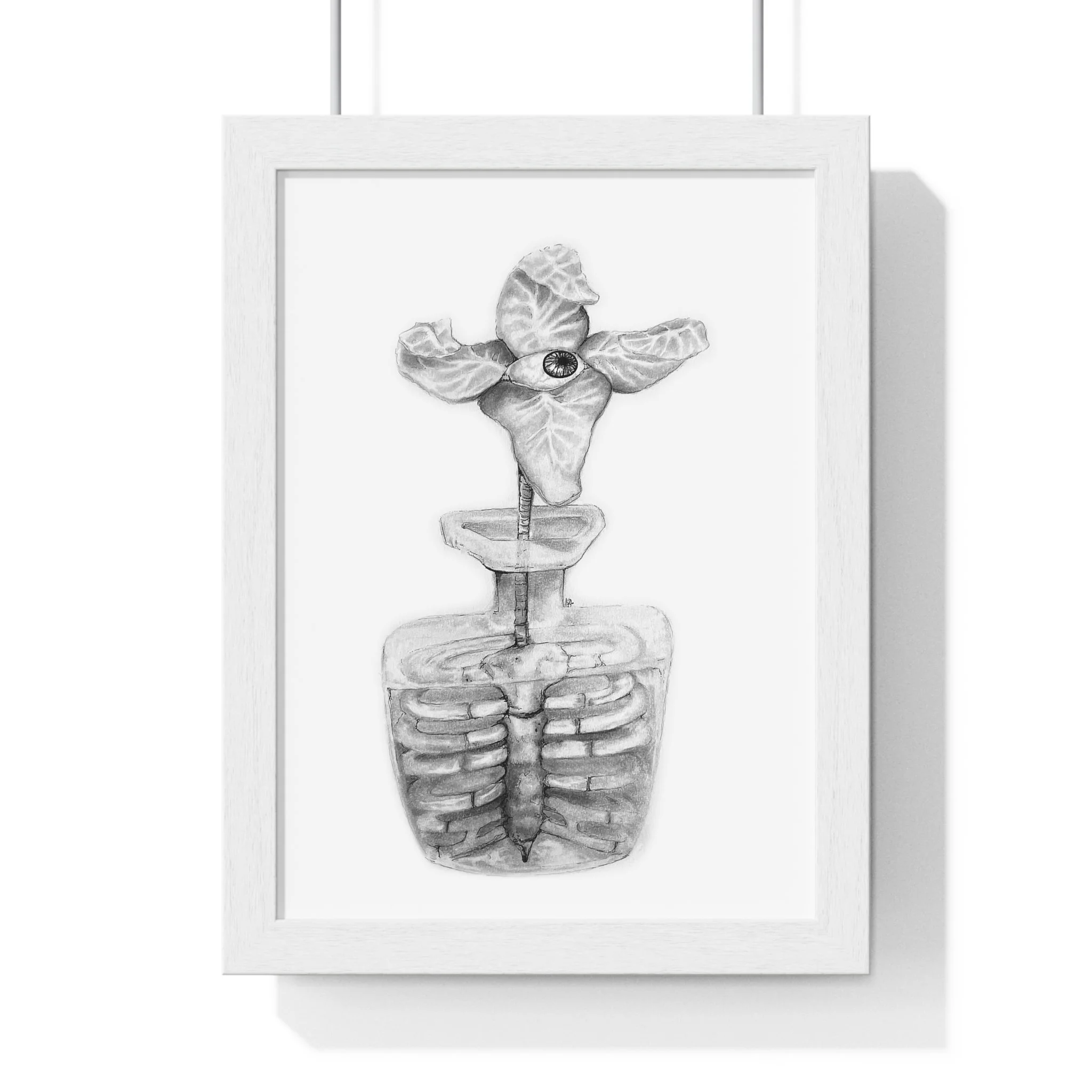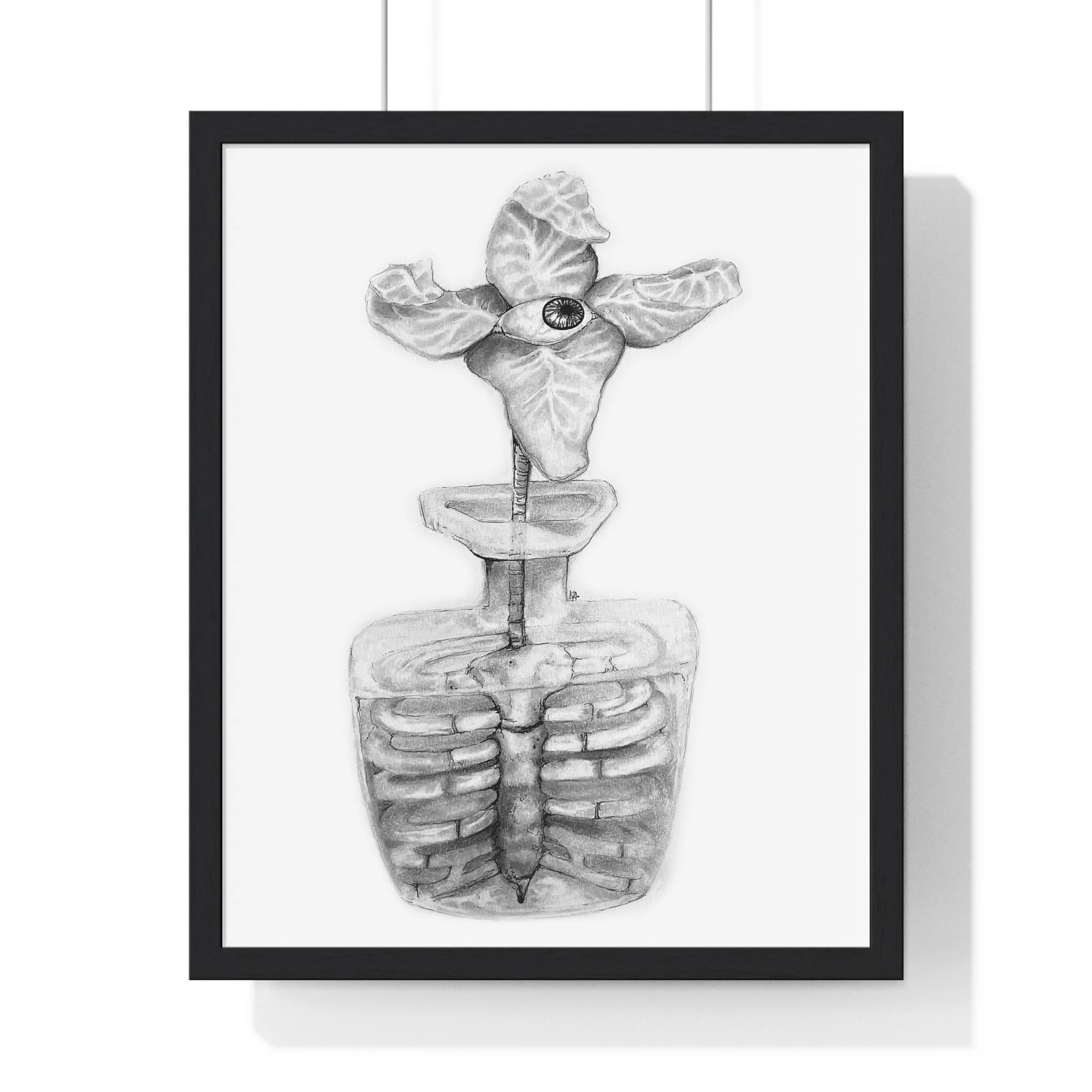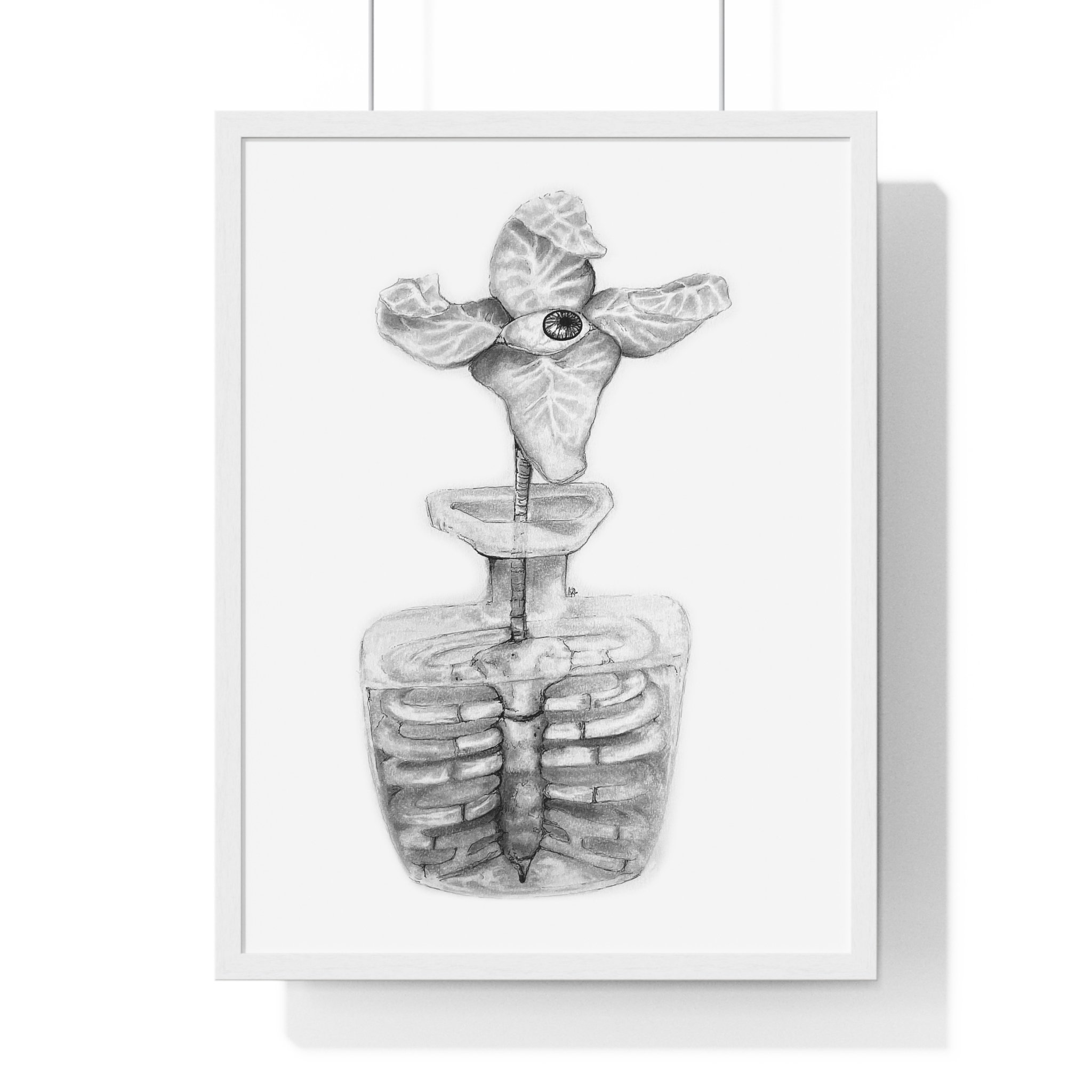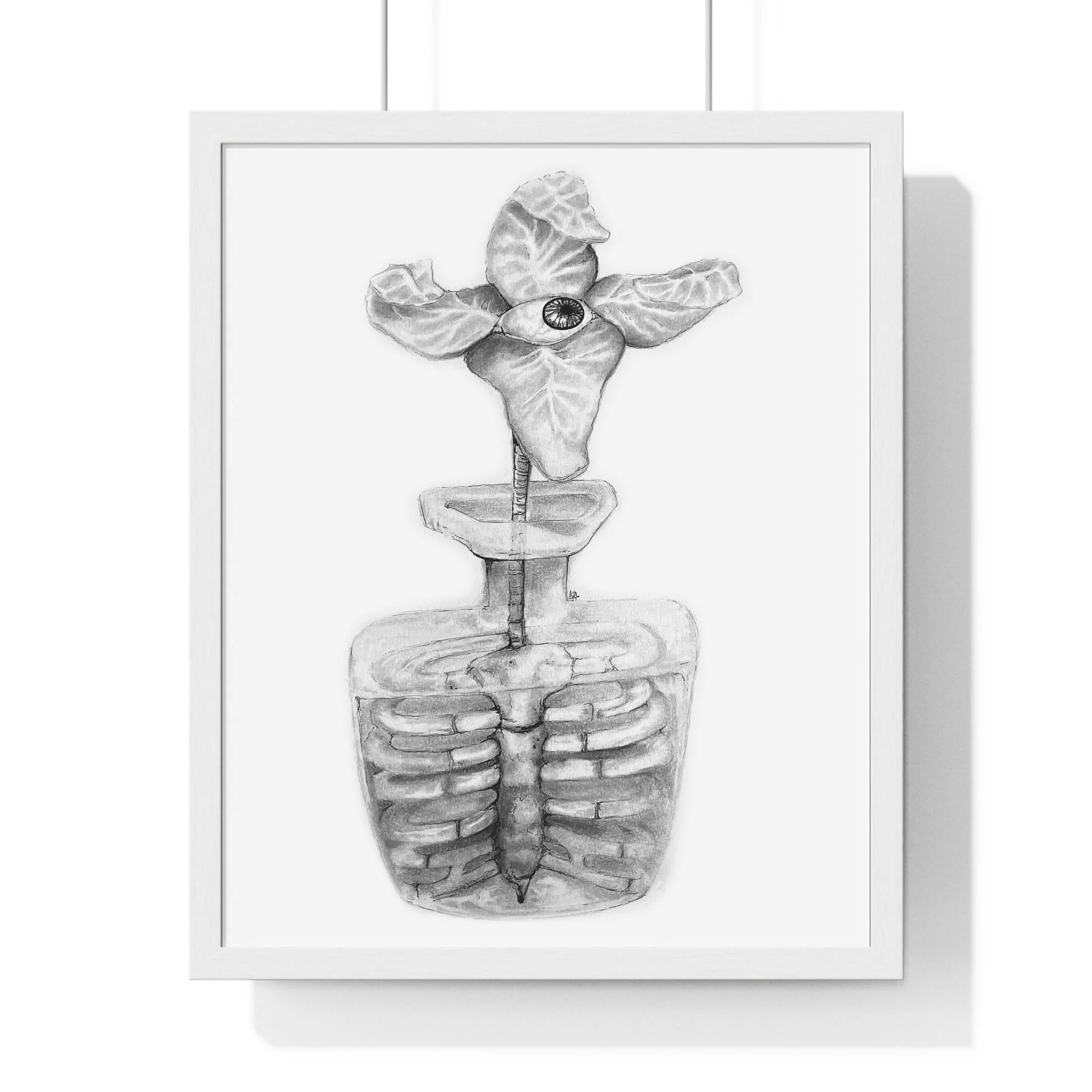 The Vessel depicts a Flora Mirabilis—a rare bloom of four petals unfolding around a single, watchful eye. The eye suggests a quiet awareness housed within form, a presence held rather than hidden. Beneath the bloom, the plant’s core becomes a ribcage, roots shaped into bone, cradling what lives within.